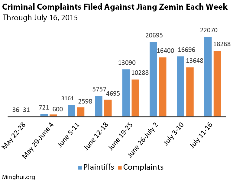 (Minghui.org) To date, 82,226 people have filed 66,528 criminal complaints against Jiang Zemin, former head of the Chinese Communist Party, between the end of May and July 16, 2015. They urge the Supreme People's Procuratorate and the Supreme People's Court to bring Jiang to justice for his abuses of power in orchestrating the violent persecution of Falun Gong in China.