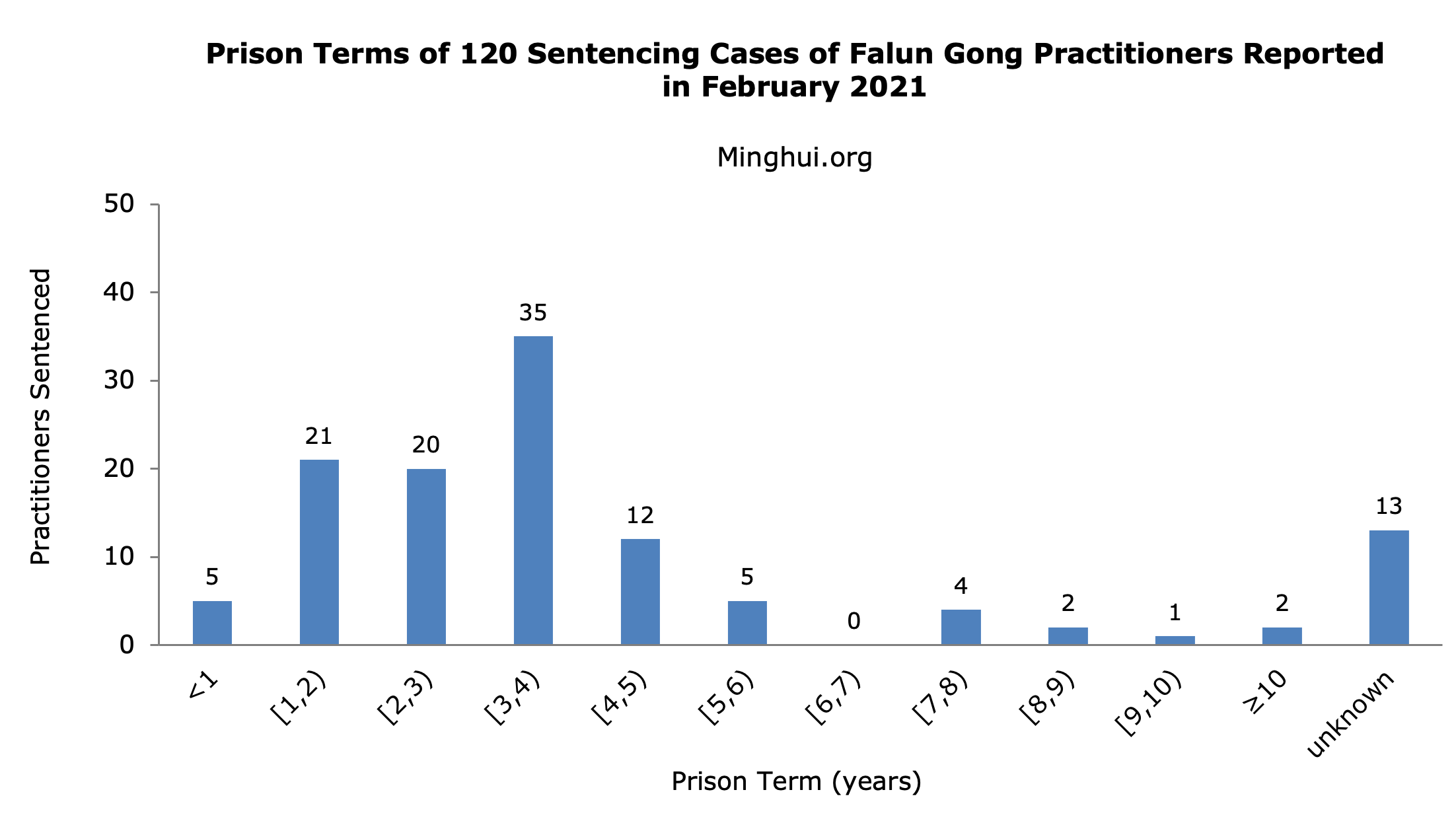 (Minghui.org) In February 2021, Minghui.org confirmed that another 120 Falun Gong practitioners were sentenced for their faith, including 47 in 2020, 12 in January 2021, and 61 in February 2021.